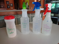 I now have spray bottles filled with 50/50 vinegar/water solution, 50/50 A&H and water solution, 100% vinegar, and a shaker bottle for A&H (made from an old empty Coffeemate Creamer container). I can’t believe how effective these cleaners are. They’re also easy to make and CHEAP!